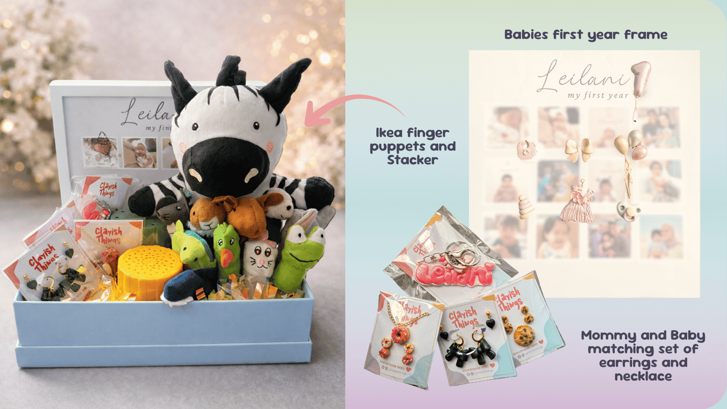 Celebrate motherhood with a thoughtfully curated Baby’s First Year Gift Box, designed to honour both mama and baby. This special set includes a first-year memory frame, matching accessories for mama and little one, plus a playful gift just for baby.