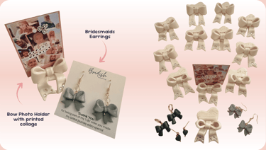 Thank your bridesmaids with a meaningful handmade keepsake. Our Bridesmaids Bow Gift Set features a pair of signature bow earrings and a matching bow photo holder for each bridesmaid, thoughtfully crafted to celebrate your special day.