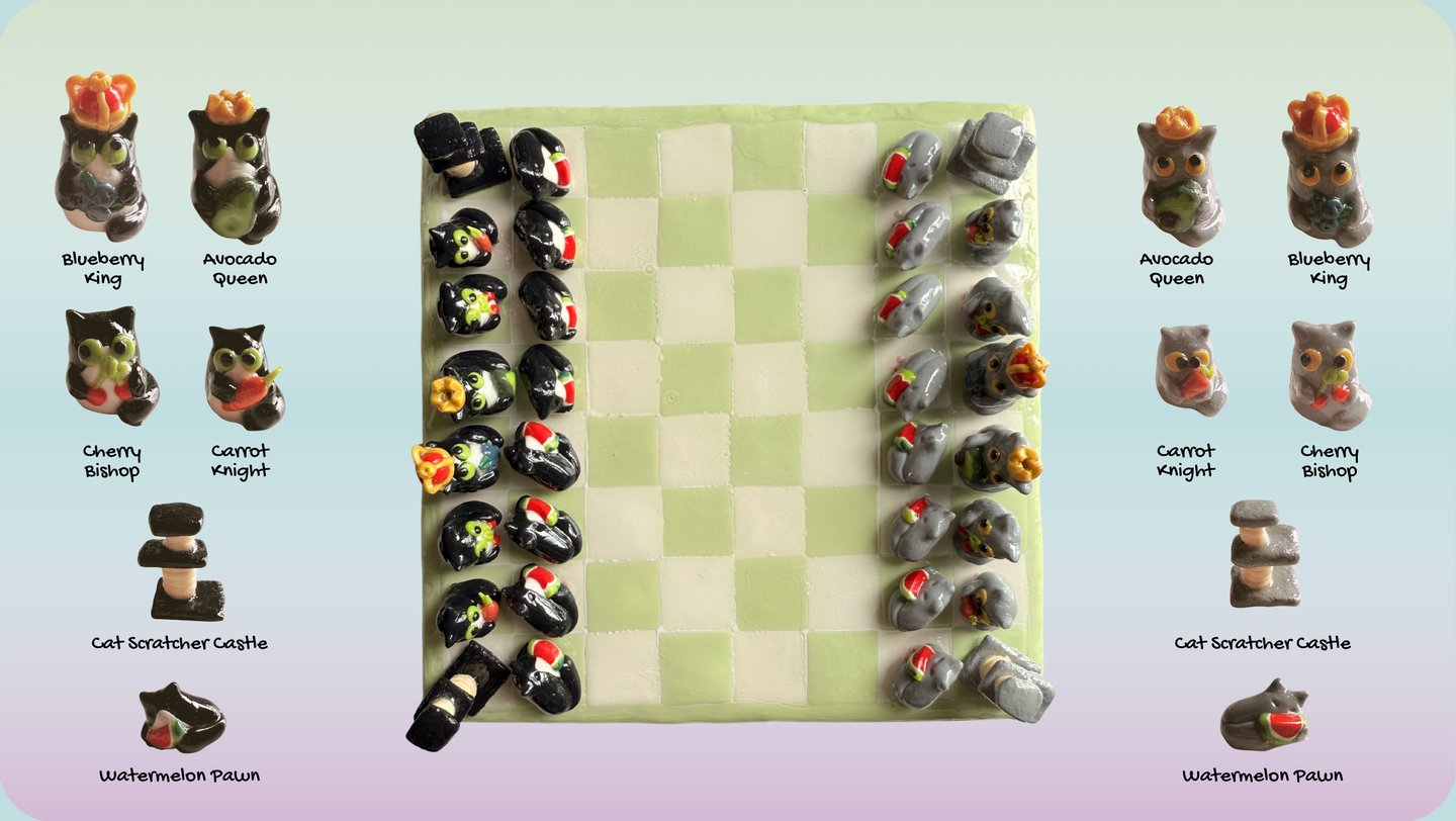 Examples: Chess or checkers set, Mini tea set, Handmade clay clock, Unique custom requests